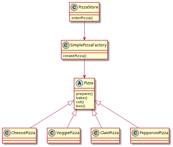 - SimplePizzaFactory: 피자 객체를 생성하는 팩토리, 이런 메소드를 static 메소드로 선언하는 경우가 종종 있다.
