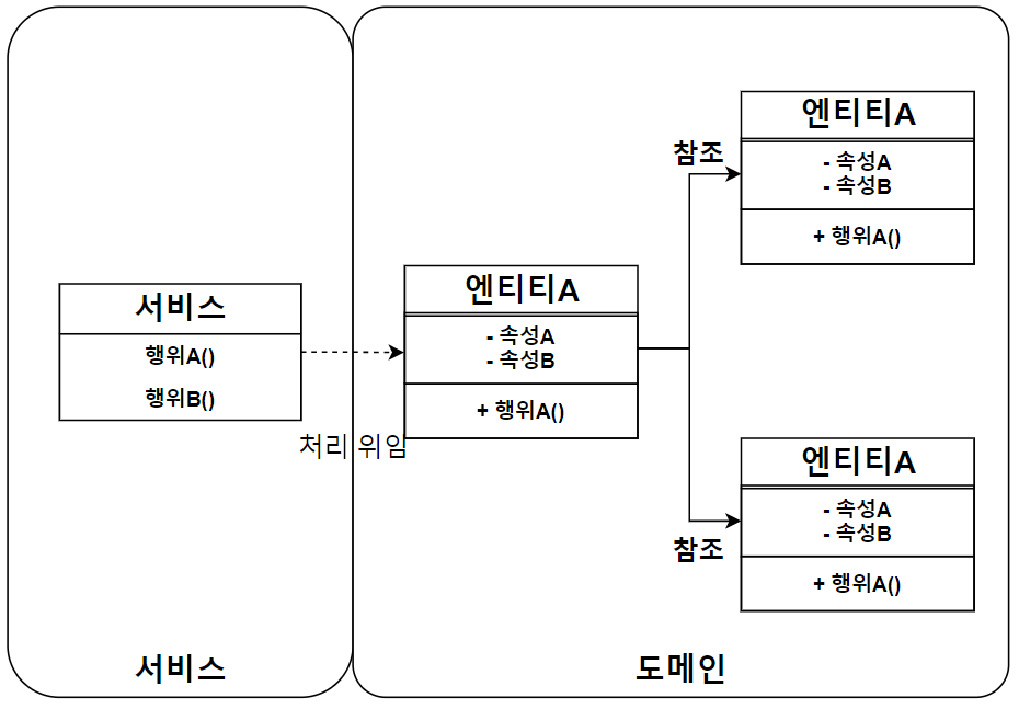 도메인 객체는 각 비즈니스 개념 및 행위에 대한 책임을 수행하고, 서비스는 비즈니스 유스케이스를 구현하기 위해 서비스의 행위를 도메인 객체에 일부분 위임해서 처리한다.