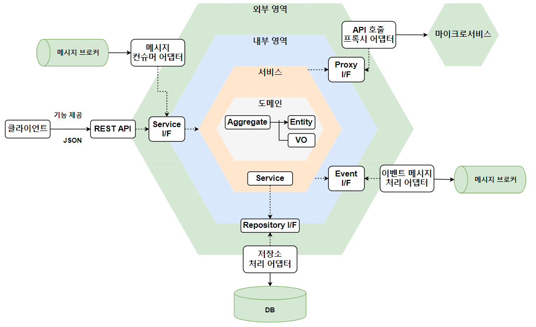 외부 영역에는 저장소 처리 어댑터뿐만 아니라 다양한 인바운드, 아웃바운드를 처리하는 어댑터가 위치한다. REST API를 처리하는 어댑터, 이벤트 메시지를 처리하는 어댑터, 메시지를 구독하는 메시지 컨슈머 어댑터, 다른 마이크로서비스의 API를 호출하는 프록시 어댑터 등이 위치한다. 이런 아웃바운드 어댑터는 DIP를 적용하여 외부 영역에서 내부 영역에 의존하도록 설계한다.