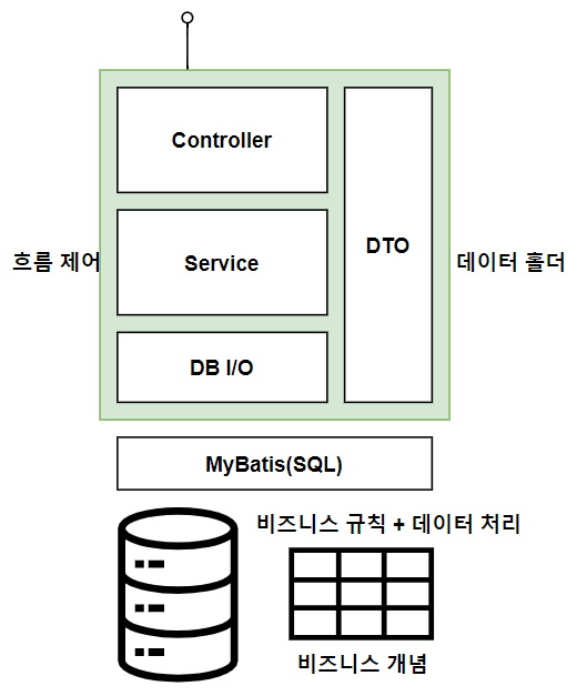 일반적으로 스프링 프레임워크를 사용한다면 컨트롤러(Controller), 서비스(Service), DB I/O(Database Input/Output), DTO(Data Transfer Object)로 구성되고, 데이터 처리는 SQL 매핑 프레임워크인 마이바티스(MyBatis)를 사용한다.