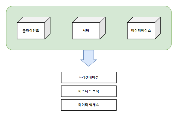 아래 그림처럼, 물리적인 서버 티어의 레이어를 프레젠테이션, 비즈니스 로직, 데이터 액세스의 3개의 논리적인 레이어로 구분할 수 있다.