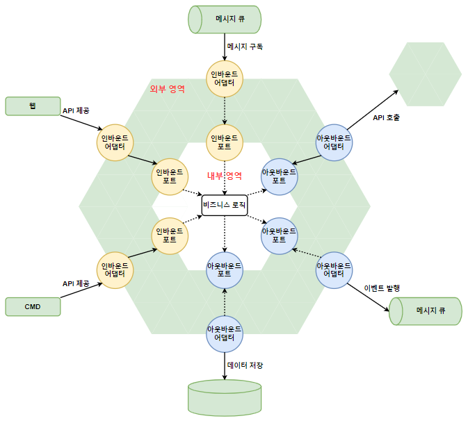 - 외부 영역은 외부에서 들어오는 요청을 처리하는 인바운드 어댑터(Inbound Adapter)와 비즈니스 로직에 의해 호출되어 외부와 연계되는 아웃바운드 어댑터(Outbound Adapter)로 구성된다.