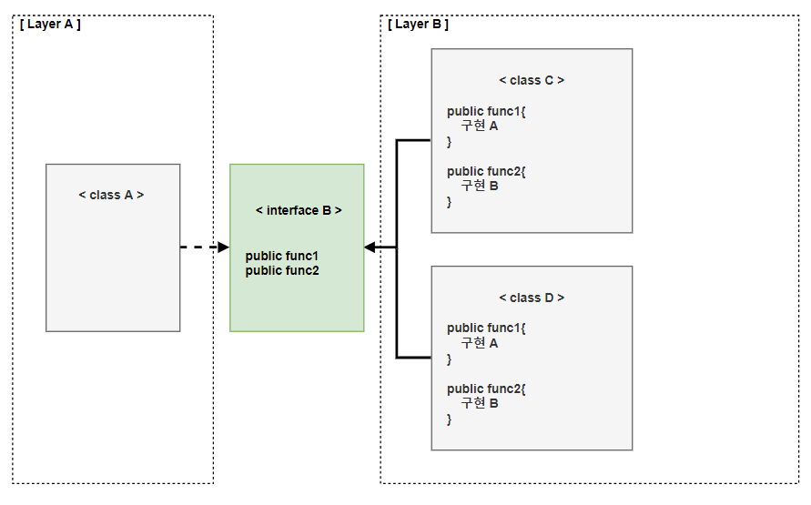 아래 그림처럼 상위 계층은 직접적으로 하위 계층을 호출하지 않고 추상적인 인터페이스에 의존한다. 이 경우 하위 계층에서는 추상적 인터페이스를 만족하는 다양한 방식의 구현체를 선택할 수 있다.