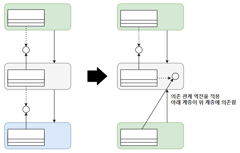 즉, 데이터 액세스 계층이 구현해야 할 인터페이스를 좀 더 고수준의 비즈니스 로직 계층에서 정의하게 함으로써 기존의 위에서 아래로 흘렀던 의존 관계를 역전시키고 고수준 영역이 저수준 영역의 변경에 영향을 받지 않게 된다.